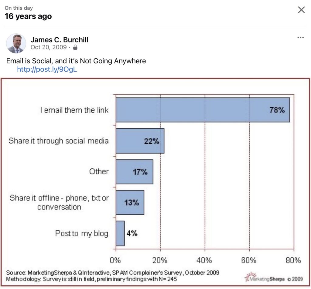In fact, a 2009 MarketingSherpa survey showed that 78% of people shared links by email — more than three times the number who used social media at the time. Even as Facebook and Twitter were exploding, email remained the heavyweight champ of online sharing.